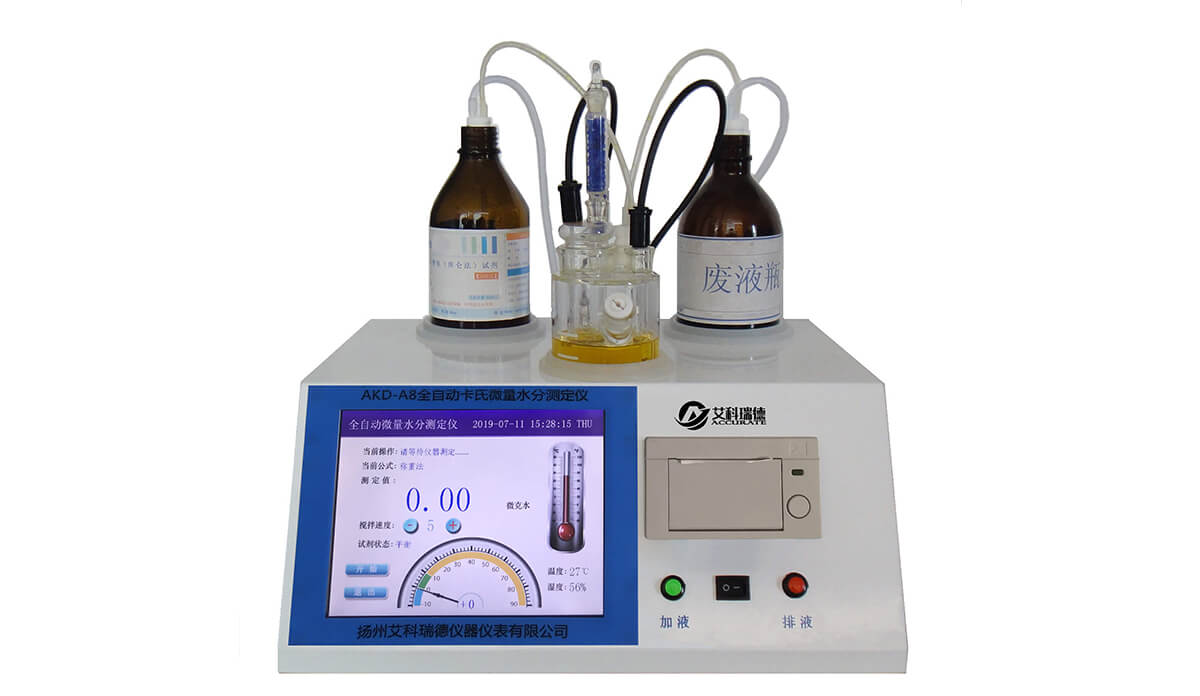 艾科瑞德牌AKD-A8全自動卡氏微量水分測定儀具有測量精度高、重復性好、測試成本低等優(yōu)點,其優(yōu)勢就是自動加排液功能,實現(xiàn)在操作過程中零接觸試劑,被廣泛應用于石油、化工、醫(yī)藥、電力、科研和教育等部門,可用于測量各種液體、固體和氣體中的微量水分。